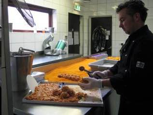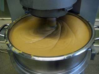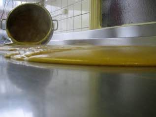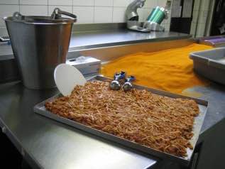De ragout word over de werkbank gegoten, op platen gelegd en daarna heel snel afgekoeld.