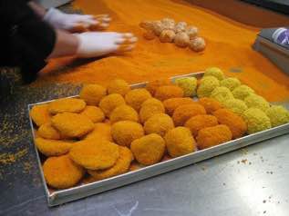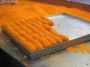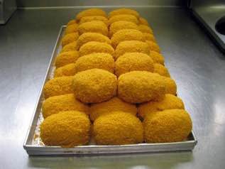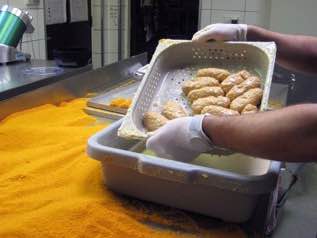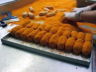 De kroketten worden hier voor de tweede keer gepaneerd.