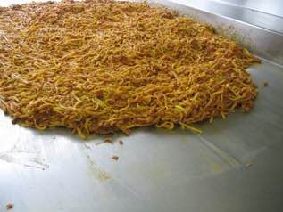 De bami word gemengd met kruiden en ingredienten, daarna op platen gelegd om vervolgens heel snel af te koelen.